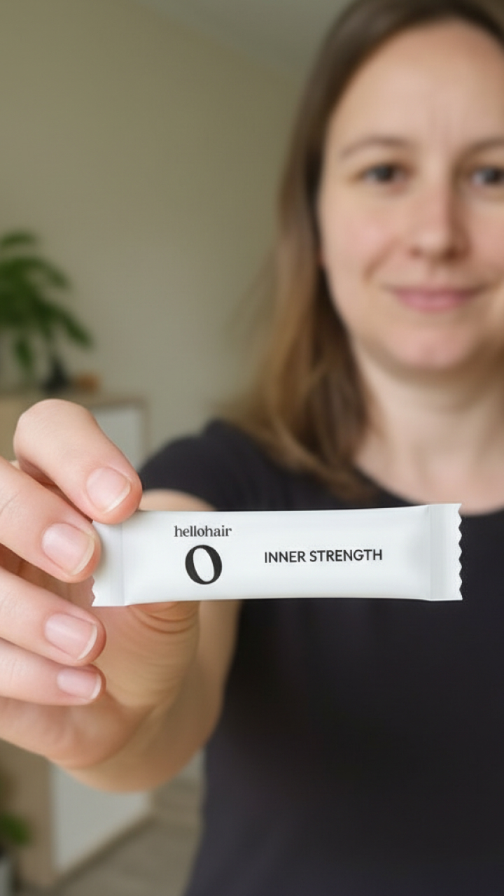 "Nach Jahren voller FĂ€rben und Styling waren meine Haare total brĂŒchig. Nach 3 Monaten mit hellohair spĂŒre ich den Unterschied â sie sind viel widerstandsfĂ€higer und glĂ€nzender!"