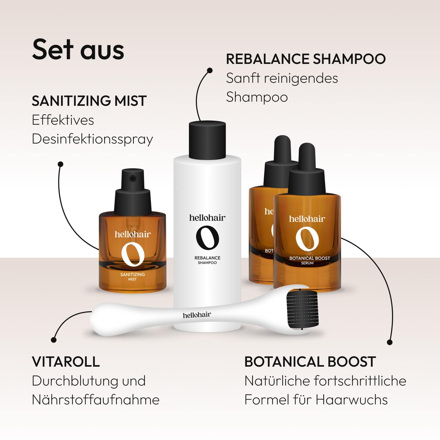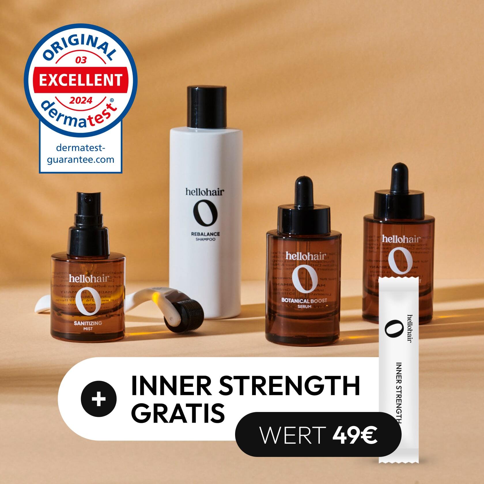 hellohair Starter Pack Grow Men kombiniert hochwirksame, natĂŒrliche Inhaltsstoffe, die in klinischen Studien bewiesen haben, dass sie Haarausfall reduzieren, das Wachstum anregen und das Haar langfristig stĂ€rken.